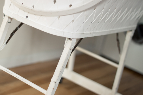 I remember being super excited when we found the chair, besides the loose wheel, it was in great shape and surprisingly very comfortable to sit in (I'm not positive how old it really is, if you look below you will see one of the metal parts says 1923, but i'm not sure if that is when it was actually made). I believe the woman who sold it to us was asking $20 for it...and when I asked her if she would mind taking $15 instead, she seemed more then overjoyed that I was willing to pay even that much.